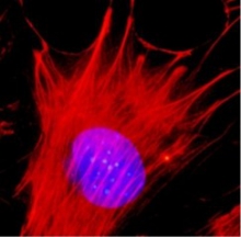 鬼筆環(huán)肽是一種從鬼筆鵝膏中得到的有毒的環(huán)狀七肽,可以與纖維肌動(dòng)蛋白絲非常特異的結合,并且具有很高的親和力。它能使肌動(dòng)蛋白聚合物的臨界濃度降低到小于1μg/mL,因此,常作為一種聚合促進(jìn)劑使用。該物質(zhì)可以被羅丹明染料標記,從而作為肌動(dòng)蛋白抗體替代物廣泛用于組織細胞培養、組織切片或無(wú)細胞系中的肌動(dòng)蛋白標記。被羅丹明標記的肌動(dòng)蛋白絲其生物學(xué)特性未發(fā)生改變(包括與肌球蛋白結合的能力)。