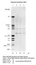 Contents: ??Unlabeled Control DNA 1, 100 μg/ml ??Unlabeled Control DNA 2, 200 μg/ml ??DNA Dilution Buffer ??DIG-labeled Control DNA, 5.2 μg/ml ??10x Hexanucleotide Mix ??10x dNTP Labeling Mixture ??Klenow Enzyme, Labeling grade, 2 U/μl ??Anti-digoxigenin-AP-conjugate, 750 U/ml ??NBT/BCIP Concentrated Stock Solution ??Blocking Reagent?
